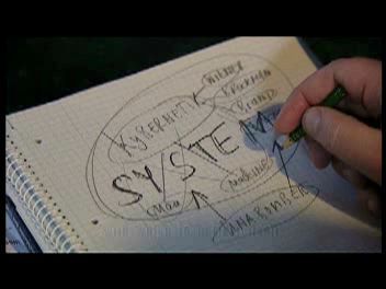 'Secret basic patterns and systems...' This, in my opinion, is the red meat of parapolitical inquiry, in a nutshell. At this point, Dammbeck begins drawing a diagram, one to which he will frequently return throughout the film.ART / TECHNOLOGY / COMPUTER